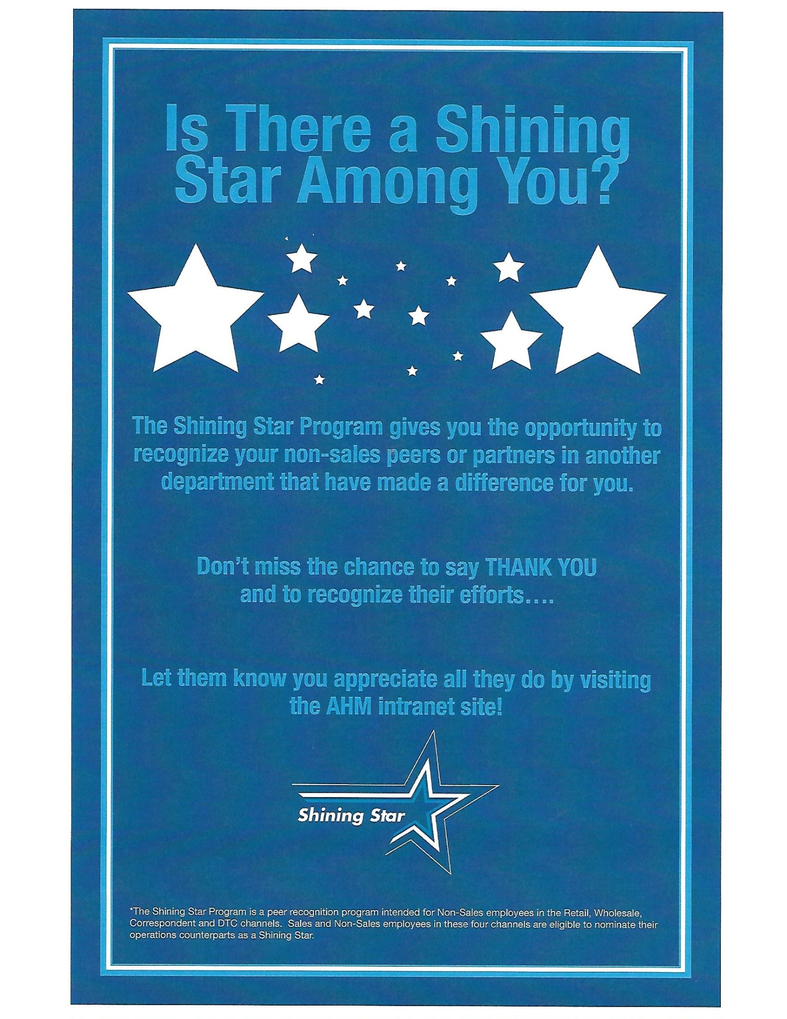 23rd April 2020 AHM Shining Star Poster I wrote and produced this internal poster promoting the Shining Star initiative, one of a variety of peer recognition programs our department conceived and promoted to facilitate employee engagement.